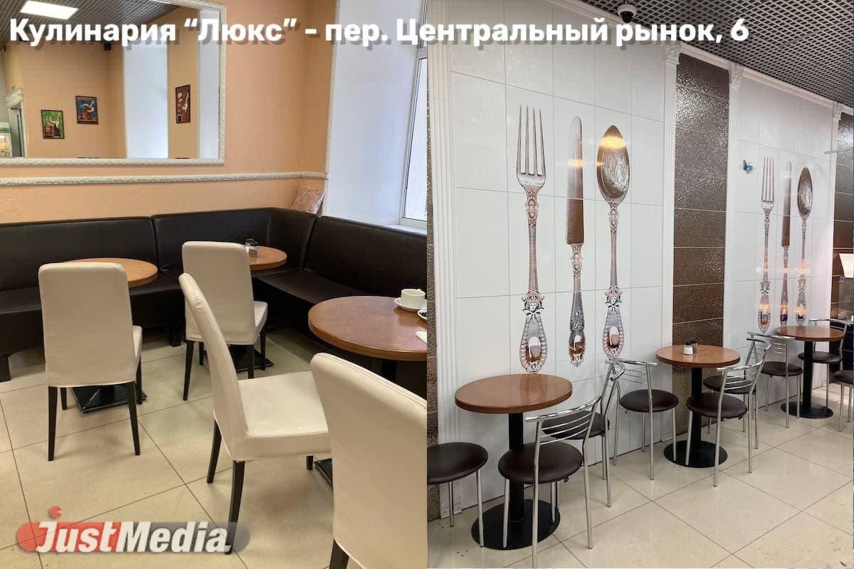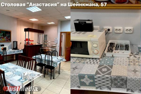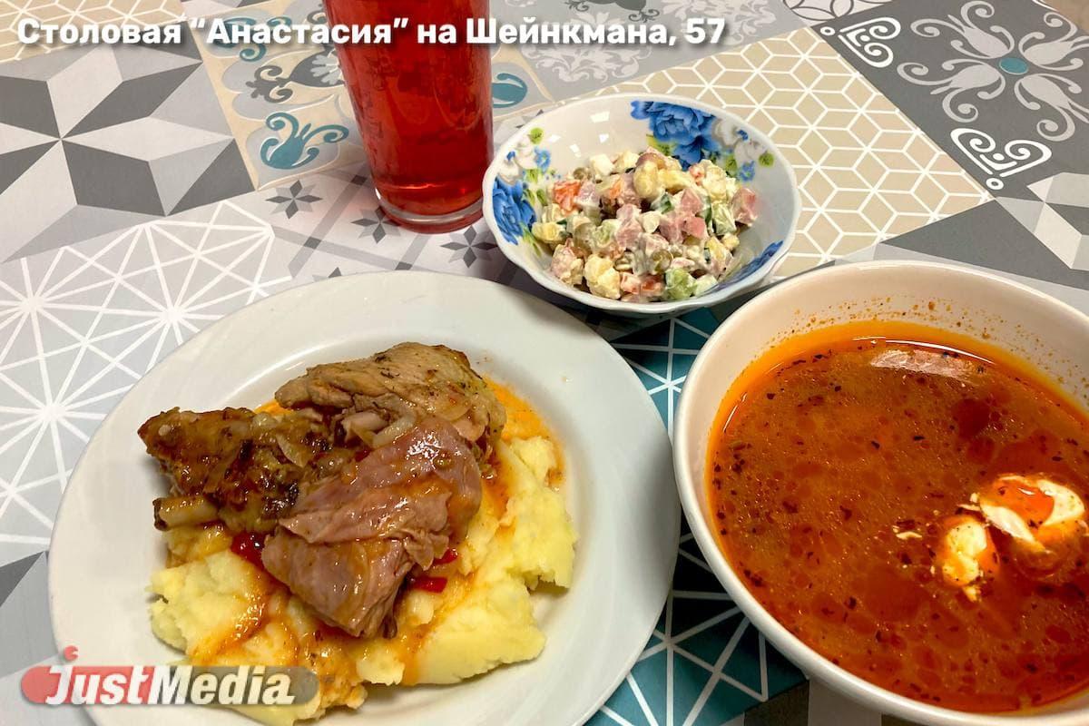 Столовая «Анастасия» на Шейнкмана, 57 выбрана по рейтингу в 2ГИС, как одна из самых нормальных. Место неприметное, если не знать о ее существовании, вывеску найти почти невозможно. Столовая небольшая, на столах клеенчатые скатерти, рядом разномастные стулья, но все чистенько. Меню не такое разнообразное, как в «Люксе», выбор стандартный: оливье (60₽) и зеленый салат (с огурцом и капустой 60₽), рассольник (48₽) и суп с лапшой (50₽), на гарнир - пюре (46₽), макароны (42₽), рис (52₽), овощи (48₽) и чуть пошире выбор вторых блюд. Есть своя выпечка. Взяли рассольник, оливье и пюре с чахохбили (98₽). Очень по-домашнему. Пюре сливочное и однородное, оливье со сметаной (!), это радует, рассольник жидковат, но на вкус неплох, курице бы еще немного потомиться, специй достаточно. Как и везде - есть микроволновка и термопод с горячей водой. Обслуживание приятное, посетителям тут рады.