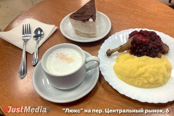 Не сговариваясь с коллегами, мы зашли во второй филиал «Люкс» на пер. Центральный рынок, 6. Интересно было, какой может быть люксовая столовая вблизи с Тихвином и другими элитными застройками. Внутри ничего особенного не замечено, классическая столовская витрина и бонус в виде витрины с десертами. Ассортимент широкий, есть и варианты завтраков, и множество салатов и горячего. А вот супы почему-то расфасованы в пластик, от этого их совсем не хочется брать. Раз уж мы в «Люксе» - пообедать решили утиной ножкой с пюре, на десерт взяли капучино и птичье молоко. Утку положили холодную к горячему пюре. Странно, но вкусно! Утка с брусничным вареньем (соусом его не назовешь), пюре как дома - ощущается молоко, нет комочков. А вот кофе брать не стоит, он тут весьма горький, кислый, но за 65 рублей. Птичье молоко очень сладкое, сверху щедрая прослойка из шоколада и нутеллы, суфле нежное, бисквит тонкий и мягкий. Обед вышел в 591₽, из них утка - 385,2₽, пюре - 72,1₽, десерт 69,6₽. Не считая утки - очень бюджетно. Сама столовая чистая, оформлена по-простому, но стулья и диваны в эко-коже, а на стенах кафелем выложены огромные вилка, нож и ложка.