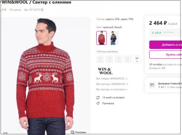 Кто бы не хотел получить на Новый год свитер с оленями? Милый подарок всегда будет в тренде для мужчины любого возраста. Если вы любительница рукоделия, то можно начинать вязать уже сейчас, как раз успеете к вручению подарка. Готовое изделие можно найти на одном из маркетплейсов страны.