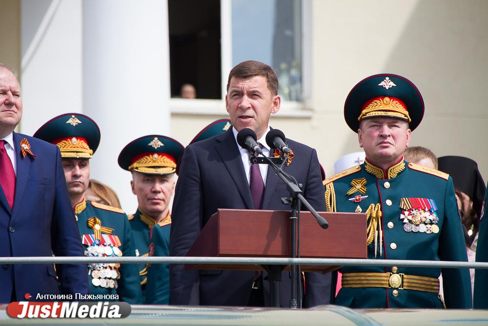 После «Вальса победы» на главный городской проспект Верхней Пышмы вышли главные экспонаты Музея военной техники УГМК. Перед началом парада ветеранов Великой отечественной войны и тружеников тыла поприветствовал губернатор Свердловской области Евгений Куйвашев.