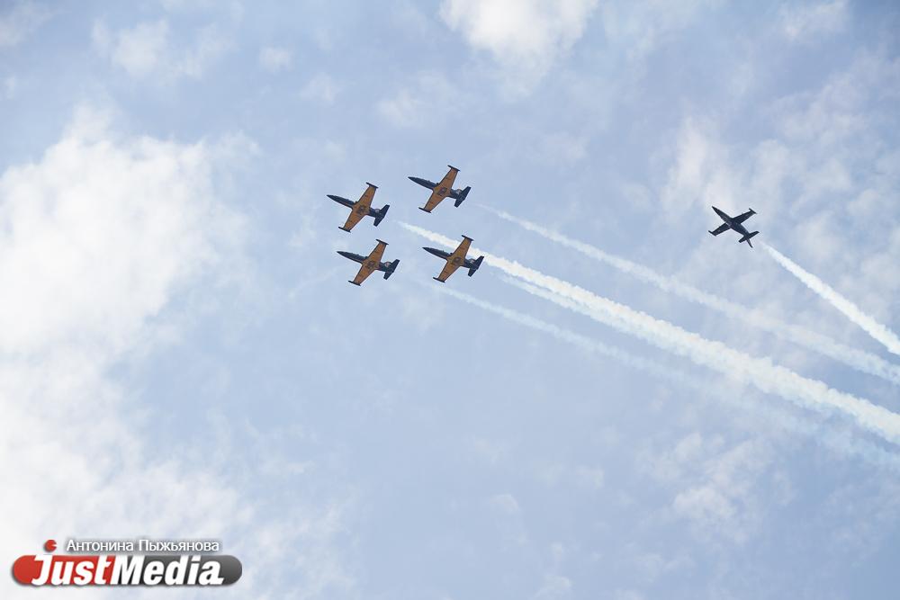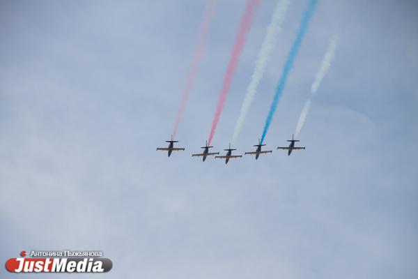 После шествия механизированной колонны в небе над Верхней Пышмой появилась авиагруппа «Русь», состоящая из пяти самолетов Л-39 «Альбатрос». Пилоты нарисовали в небе российский триколор, а также показали им бочку, булаву, петлю Нестерова и другие фигуры высшего пилотажа.