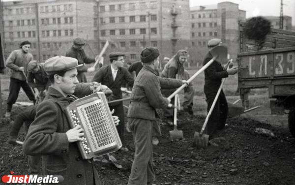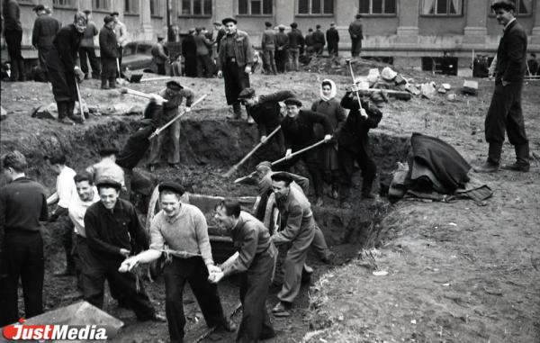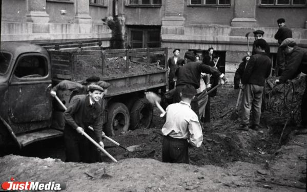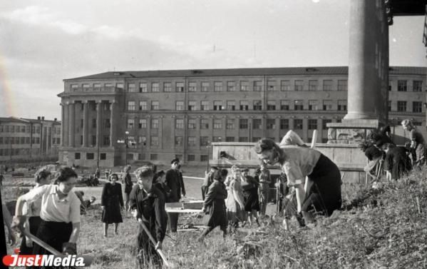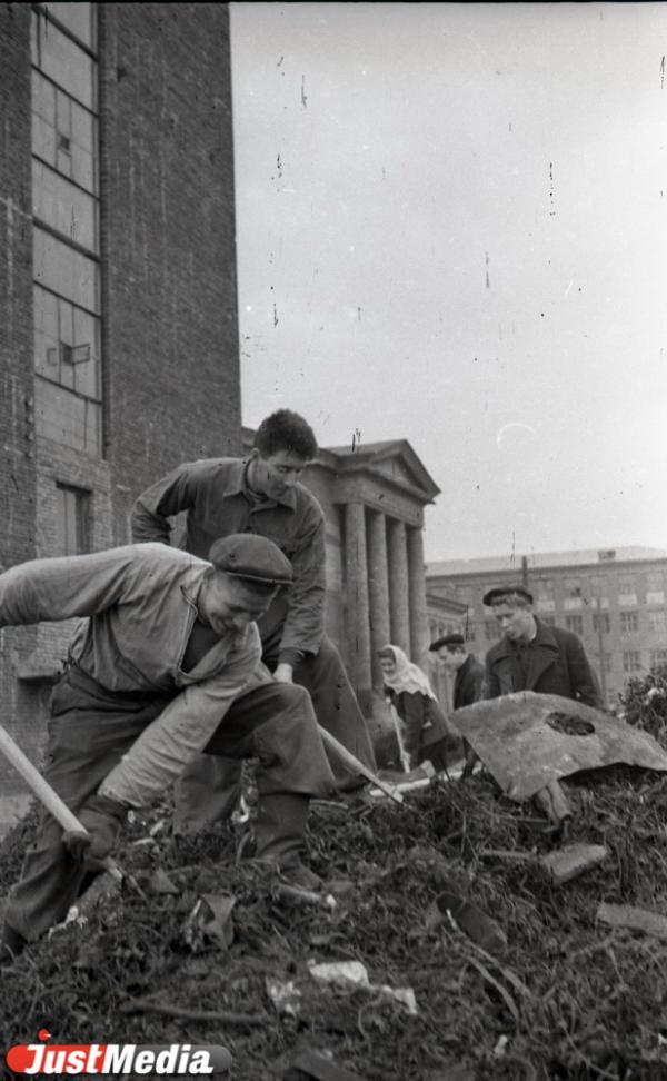 «Благоустроительные работы производились здесь после войны. На фото из Госархива региона видно, как студенты института ликвидируют кучи строительного мусора, срубают небольшой холм. К главному корпусу по Ленина прокладывается небольшая асфальтовая дорога. До этого времени к зданию вели лишь небольшие тропинки и проселочная дорога. На фото послевоенных лет видно, что вдоль трамвайных путей по Ленина в те годы еще располагались картофельные поля и приусадебные участки», — говорит Евгений Бурденков.