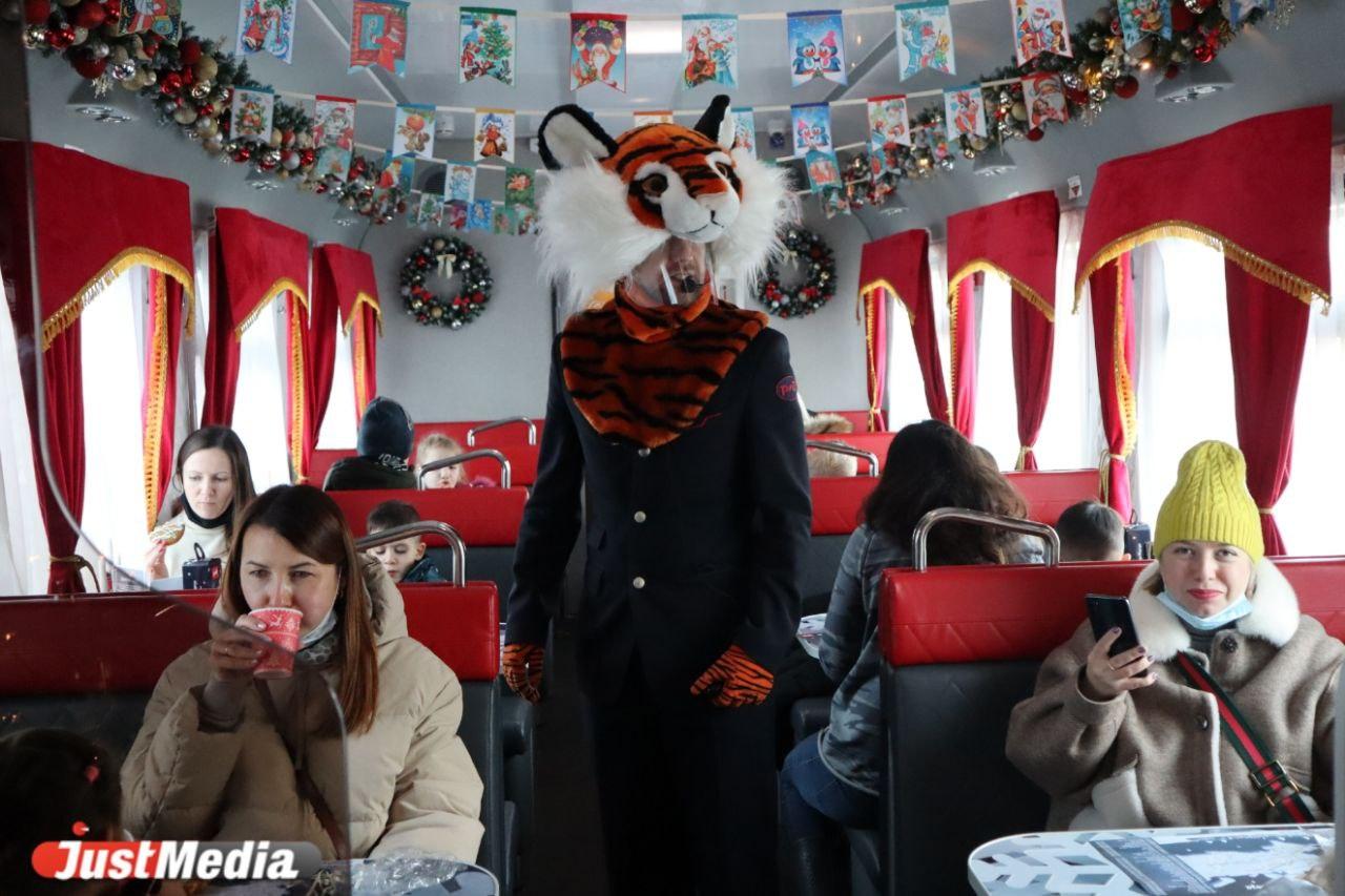 Потом проголодавшиеся дети посетили вагон-ресторан, в котором их угостили горячим чаем и имбирным пряником. Аромат был невероятный. На память они там сфотографировались с тигренком-проводником возле нарядной елки.