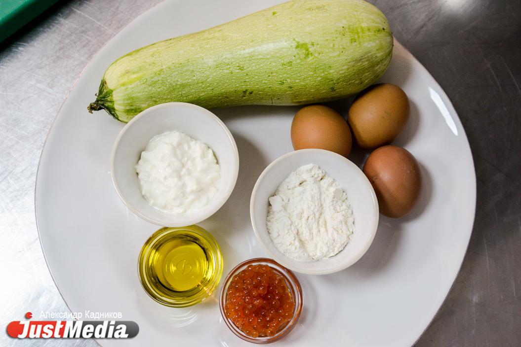 Ингредиенты для вафель: кабачок – 120 грамм, 1 яйцо, оливковое масло – 10 мл, мука – 40 грамм, икра нерки – 15 грамм, сыр страчателла – 50 грамм, микрозелень для украшения. Соль и перец добавляется по вкусу. Из этой смеси получается две вафли.