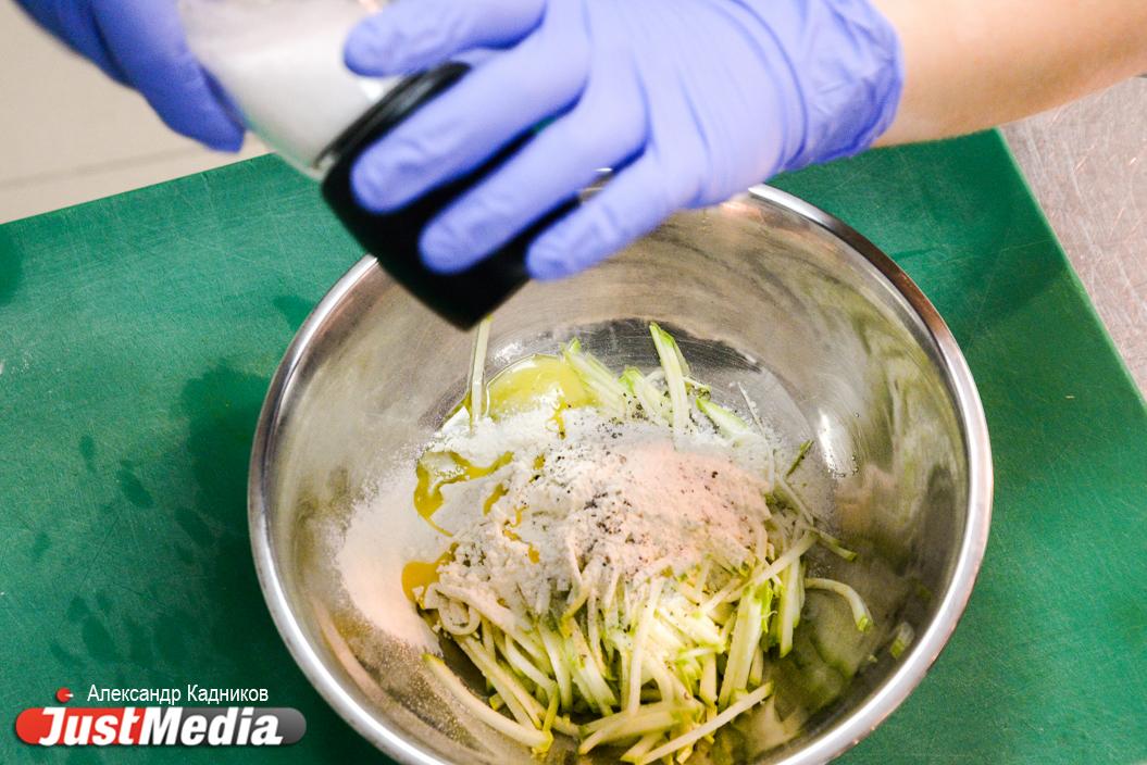 Натираем кабачок на крупной терке тонкими колечками и после уже ножом нарезаем их соломкой. Теперь можно смешивать ингредиенты: сначала к кабачку добавляем яйцо, затем муку и оливковое масло. Сверху посыпаем все это солью и перцем по вкусу. Получившуюся смесь выкладываем в вафельницу и ставим на четыре минуты.