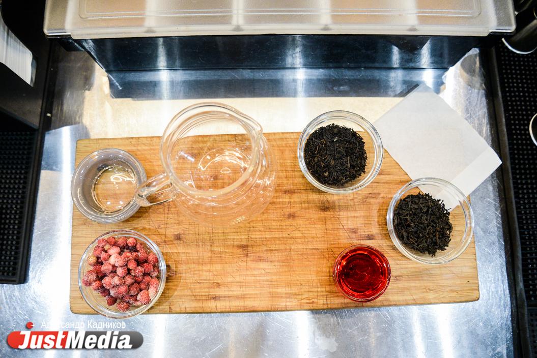 Ингредиенты для черного земляничного чая: земляничный сироп – 30-40 мл, черный чай «клубника со сливками» – 2 грамма, свежемороженая земляника – 30-40 грамм.