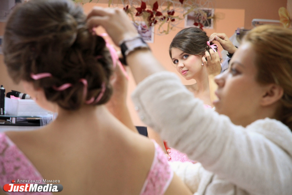 Поскольку я решила не просто перемерить все платья, а именно примерить образ невесты, выбрав первое платье, мы со стилистом начали обсуждать мэйк-ап. Как оказалось, цвета макияжа зависят не только от цвета платья, но и от его фасона. Прическа также должна соответствовать платью.