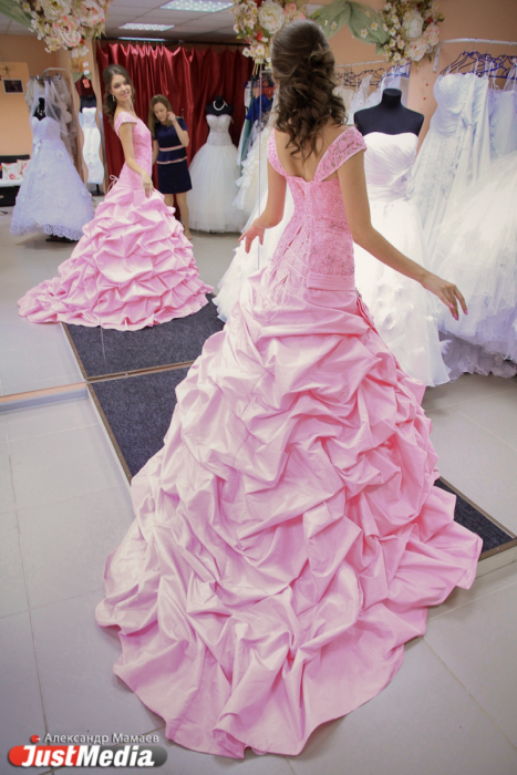 Елена рассказала, что сейчас в моде и цветные свадебные платья — белое с узорами, с яркими лентами или же просто однотонное, но не белое. Например, некоторые девушки выбирают на свадьбу красные платья. Однако традиционно считается, что в красном выходят замуж второй раз. Но важно помнить, что свадьба — это ваш праздник, поэтому если уж хочется чего-то яркого, то почему бы не забыть о традициях? Мне Елена предложила примерить розовое.