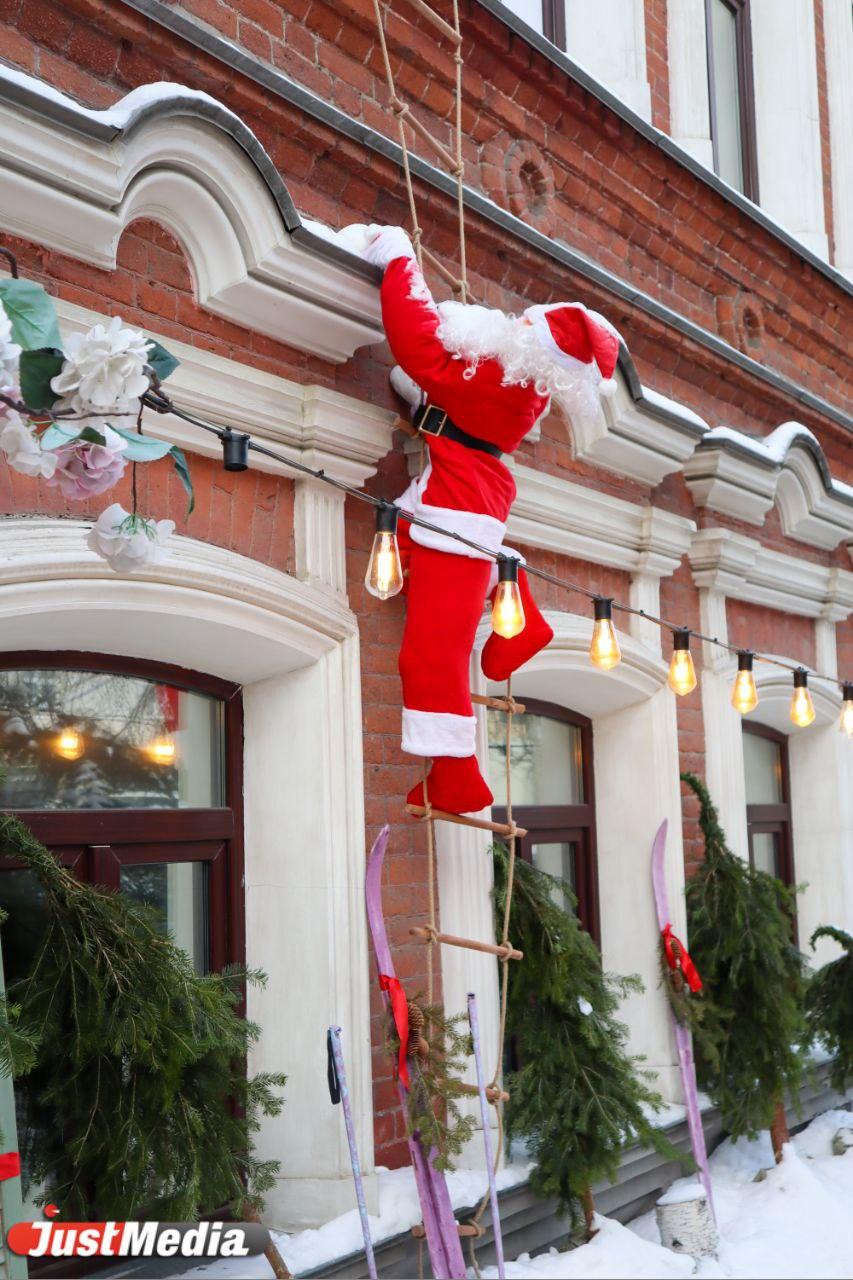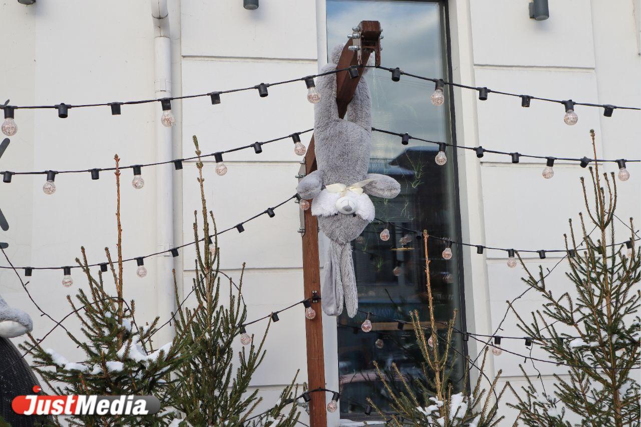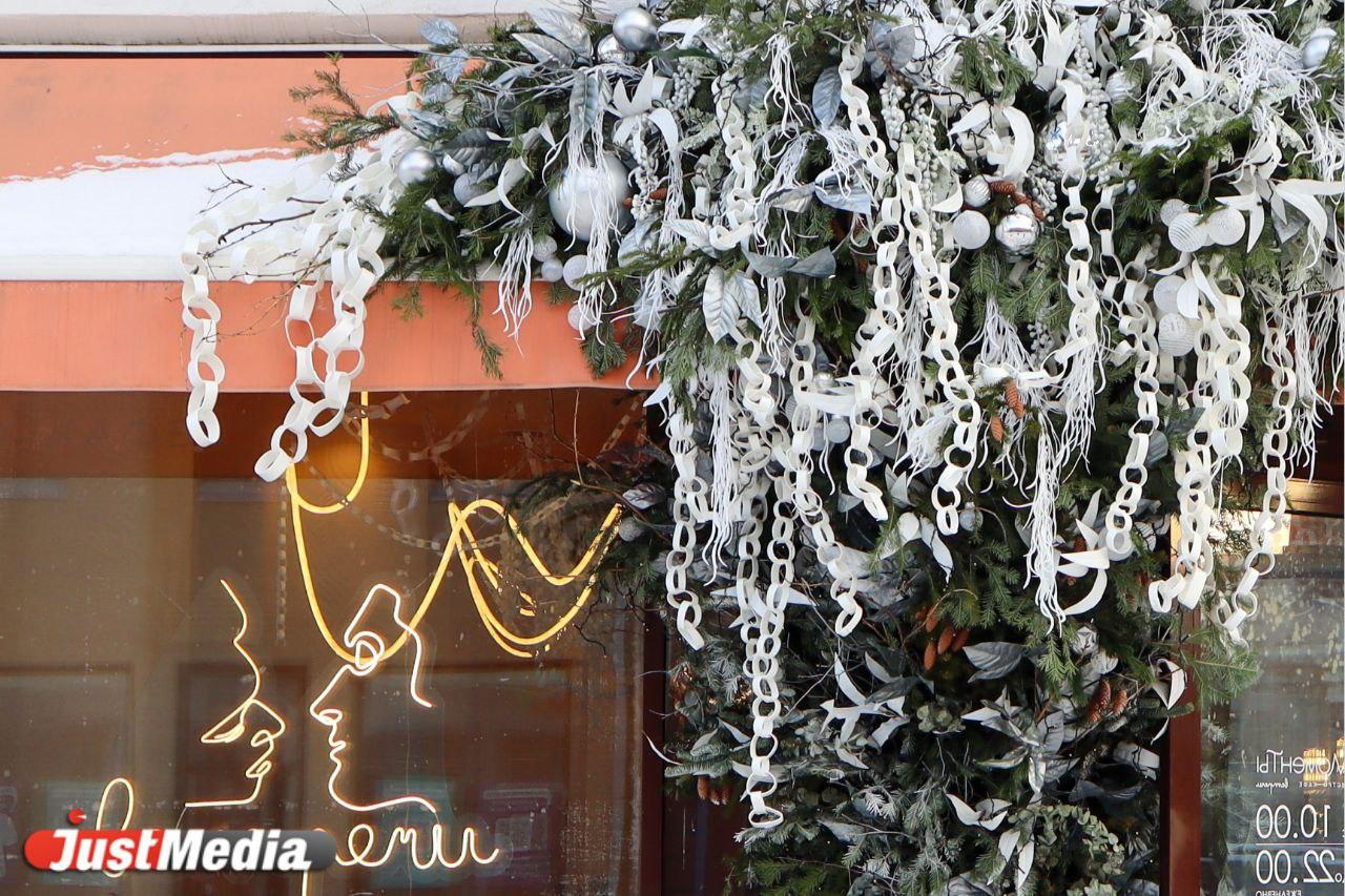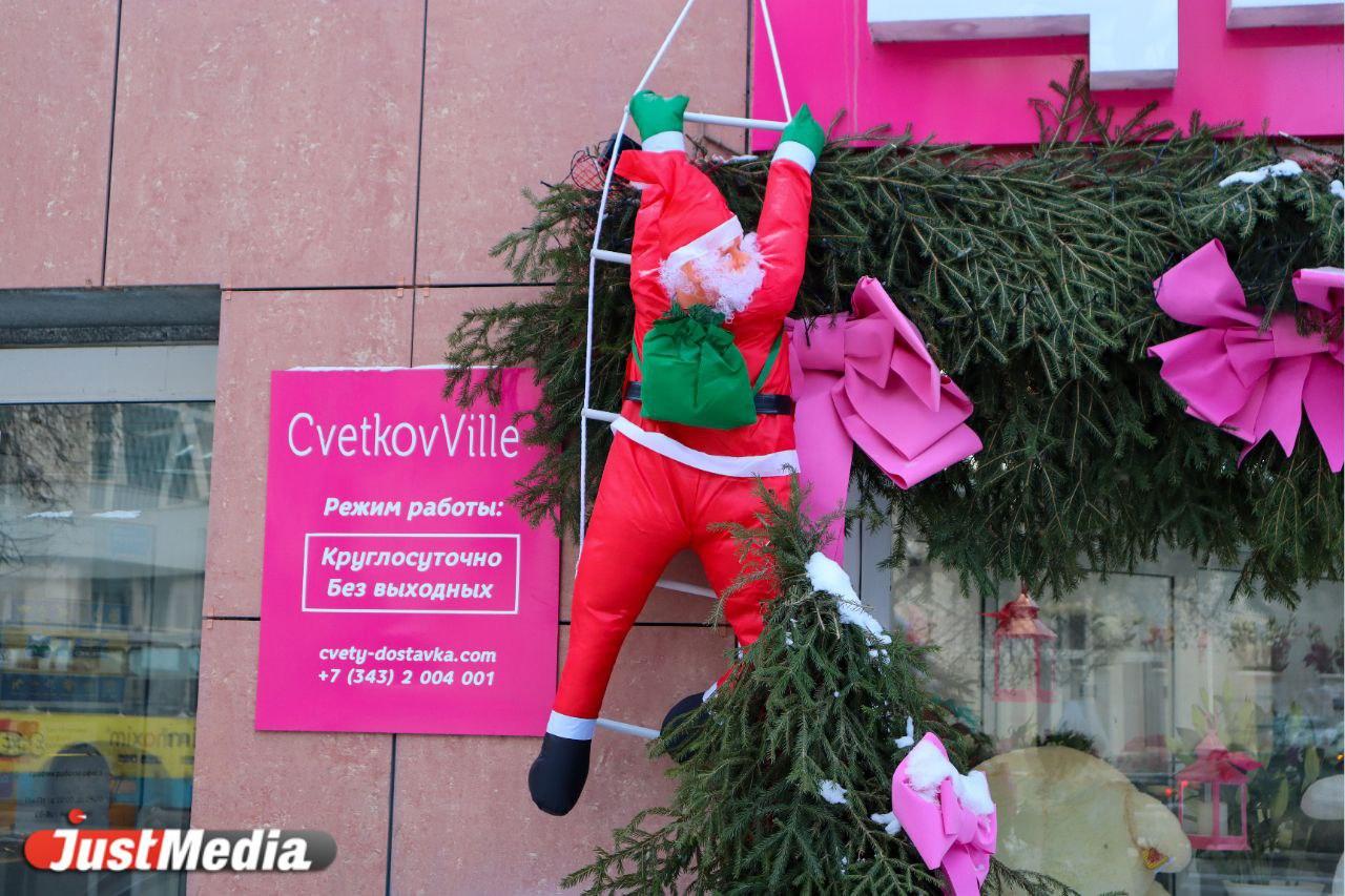 На улицах Екатеринбурга с конца ноября появилось много праздничных декораций. Чаще всего украшения можно встретить у ресторанов и кафе, но некоторые цветочные магазины, небольшие кофейни и ларьки тоже себе в таком не отказывают. Корреспондент JustMedia.Ru прошелся по городу в поисках новогодней красоты и встретил много странных решений в праздничном декоре. Вашему вниманию ─ зайцы на виселице, кольца из бумаги и полусдутые Санта-Клаусы.