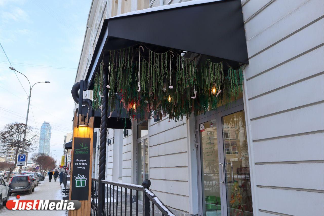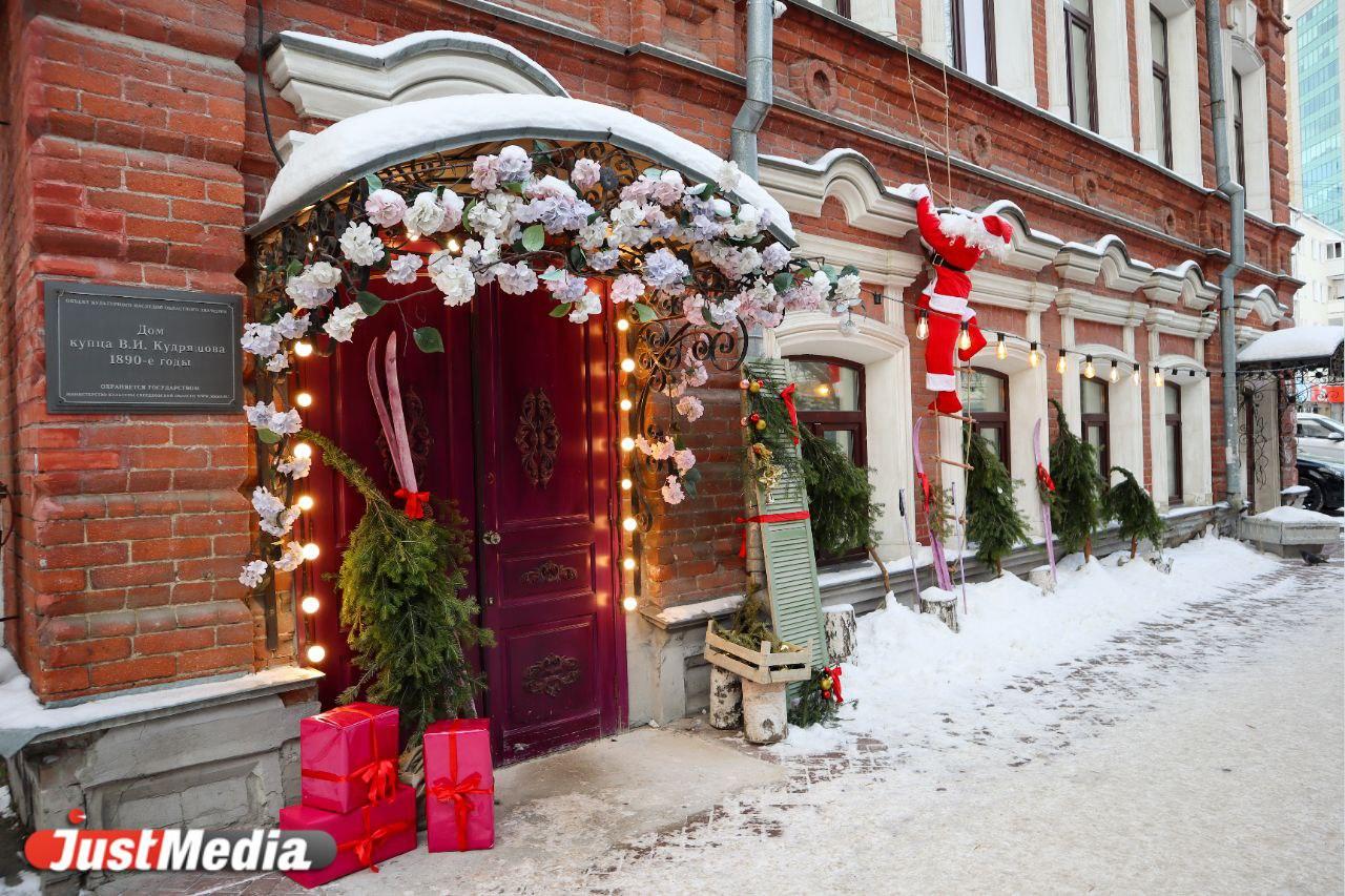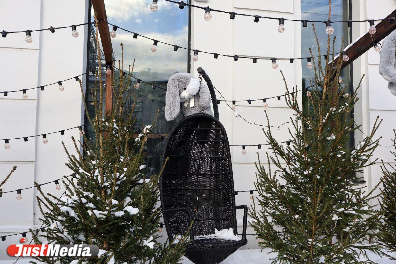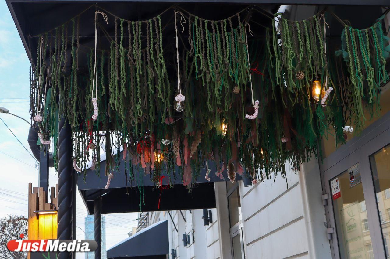 На улицах Екатеринбурга с конца ноября появилось много праздничных декораций. Чаще всего украшения можно встретить у ресторанов и кафе, но некоторые цветочные магазины, небольшие кофейни и ларьки тоже себе в таком не отказывают. Корреспондент JustMedia.Ru прошелся по городу в поисках новогодней красоты и встретил много странных решений в праздничном декоре. Вашему вниманию ─ зайцы на виселице, кольца из бумаги и полусдутые Санта-Клаусы.