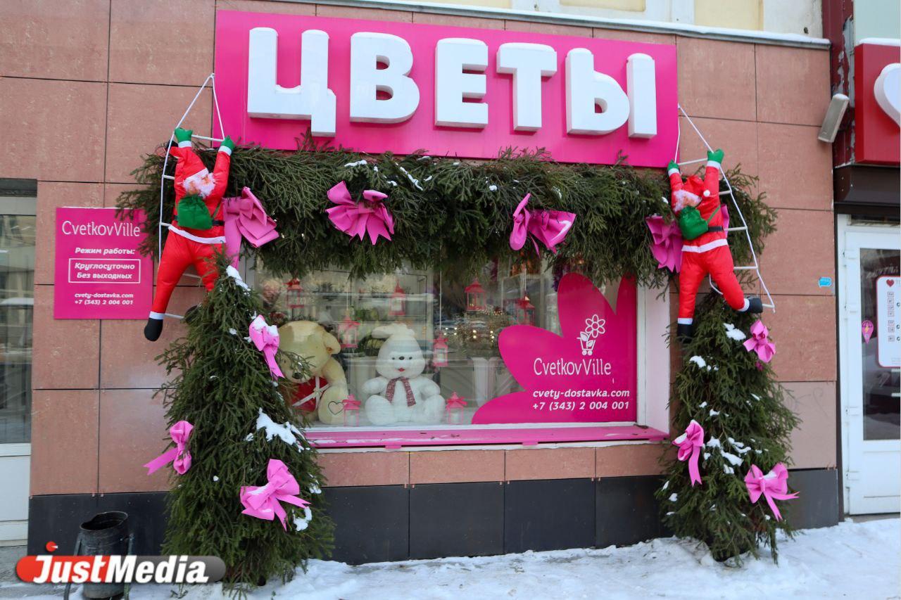 Новогодний декор цветочного магазина «CvetkovVille» также сразу бросается в глаза. Пышные еловые ветви с большими розовыми бантами и два Санта-Клауса, которые по веревочной лестнице карабкаются к вывеске.