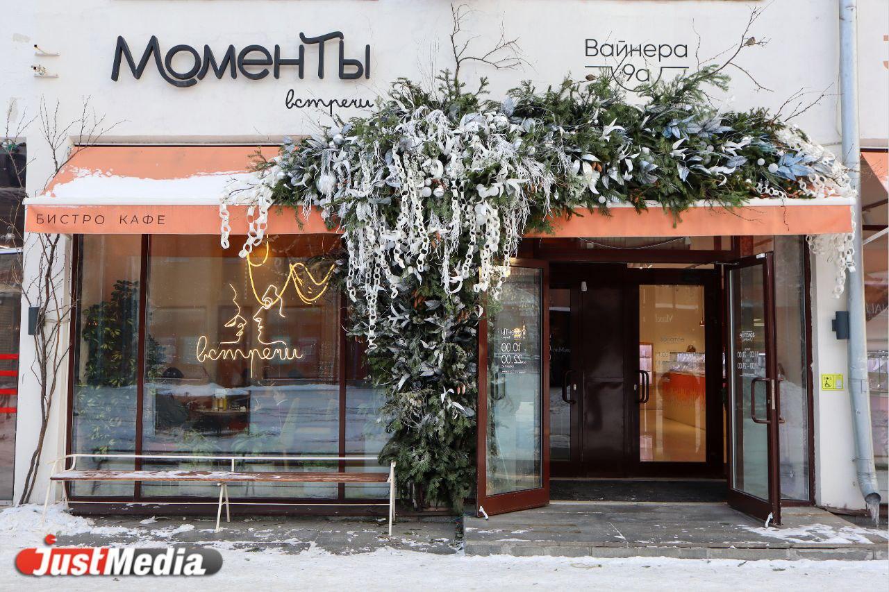 Вход бистро «Моменты» в этом году украсили еловые ветви, искусственные цветы и бумажная гирлянда. В целом, детали сочетаются по цвету и гармонируют друг с другом. Немного выбиваются бумажные белые цепочки, которые навешены кучками с двух сторон украшения.