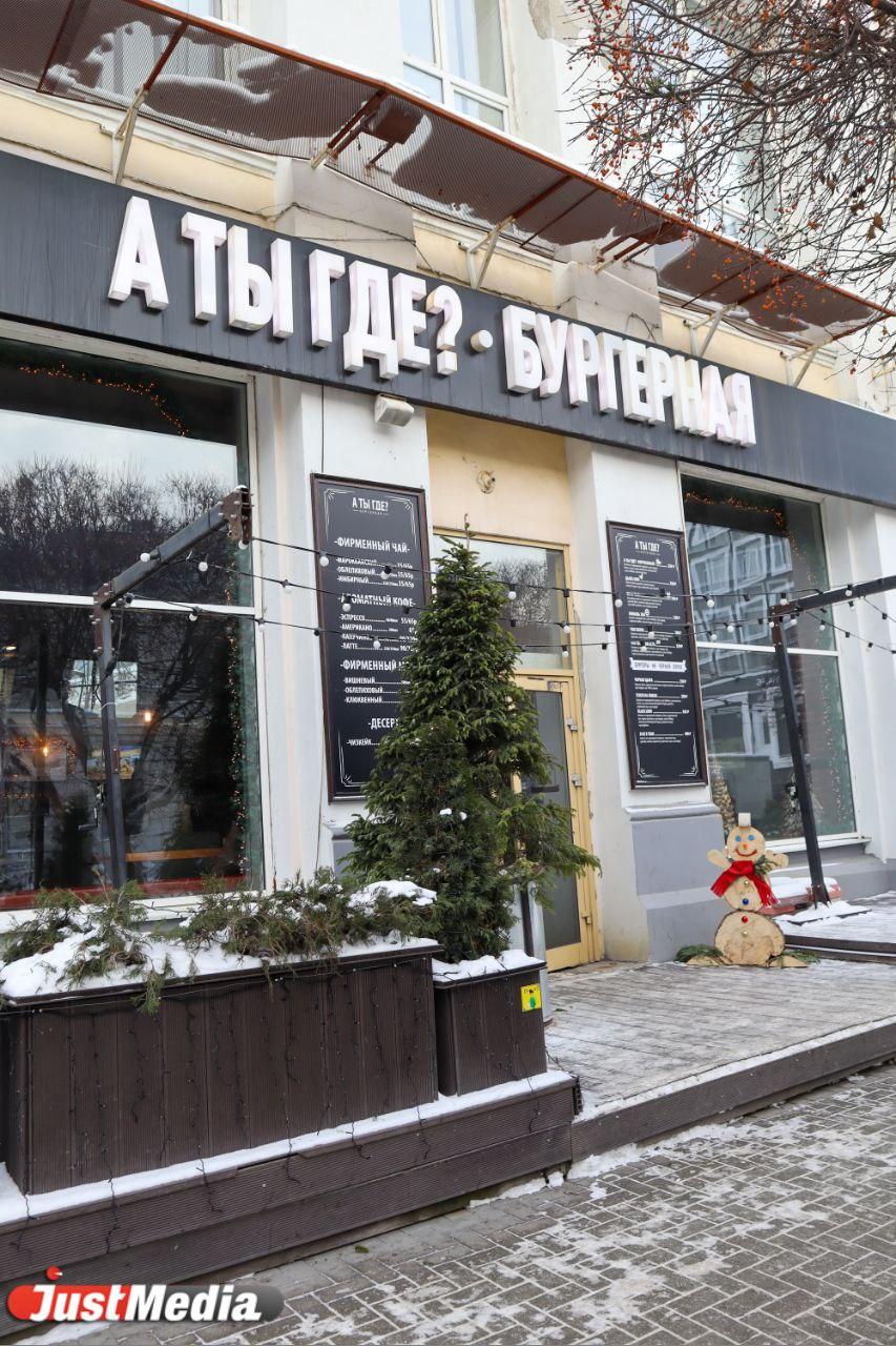 У входа в бургерную «А ты где?» гостей встречают с одной стороны елка, а с другой − деревянный снеговик, который сделан немного неаккуратно. На ножках у поделки еловые ветки, глаза и рот прикреплены скобами для степлера.