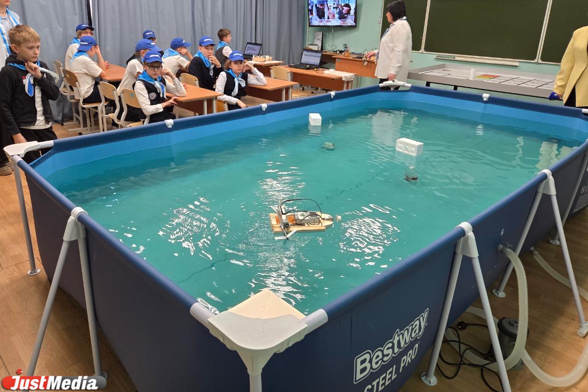 Более сочная картинка нас ждет в «Акваробототехнике». Младшеклассники сидят за партами и управляют робо-лодочкой в бассейне справа от них. Моторизированное судно двигается вперед благодаря двум боковым лопастям и должно проплыть от одной стенки к другой и обратно. При этом судно не должно задеть буйки.