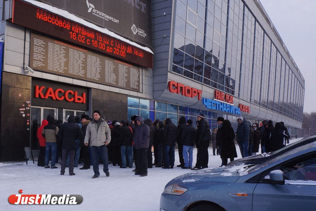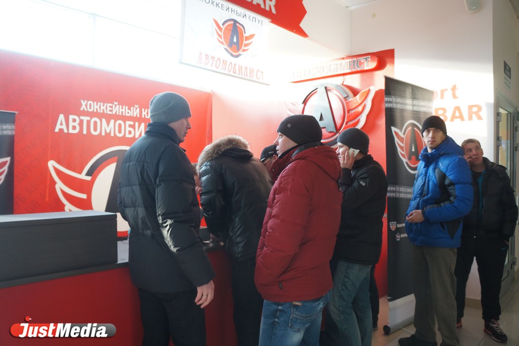 Кассы «Уральца» открываются в 11.00, но уже за час у дверей довольно много народу — несмотря на мороз и будний день. Настроение у людей хорошее, никто не ругается, все терпеливо ждут открытия. Очередность болельщики определили еще накануне. Около десятка человек дежурят здесь со вчерашнего вчера, спали в машинах. Раньше всех место застолбил Александр Фокша.