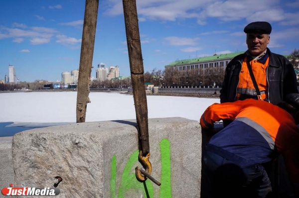 Гранитный блок набережной, который вандалы столкнули в городской пруд, встал на свое место