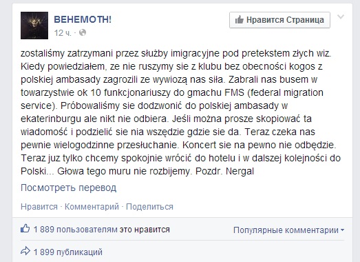 На страничке фронтмена группы Behemoth Адама Nergal Дарски появился пост о том, что музыкантам не дают связаться с польским консульством в Екатеринбурге: