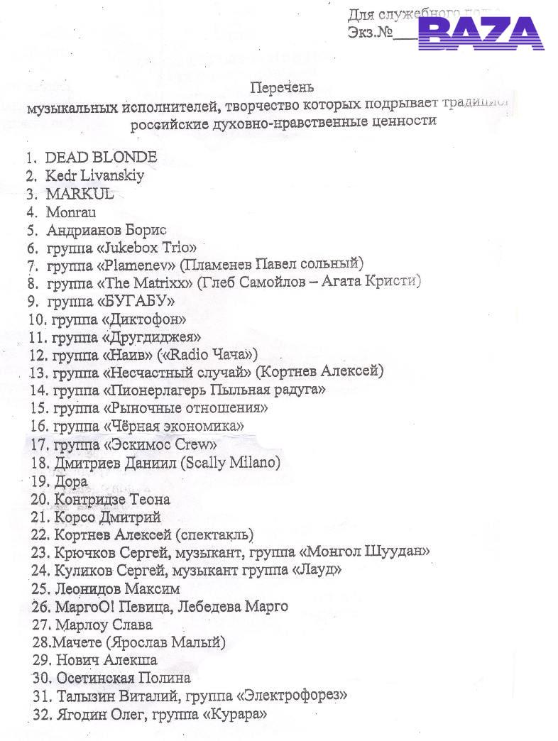 Также в перечне оказались Dead Blonde, Дора, «Монгол Шуудан», Максим Леонидов, Алексей Кортнев и «Несчастный случай», «Наив», Слава Марлоу и другие.