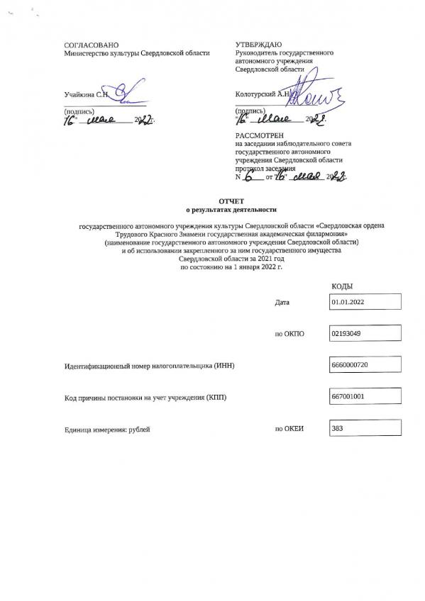 Публикация отчета о результатах деятельности Государственного автономного учреждения культуры Свердловской области «Свердловская ордена Трудового Красного Знамени государственная академическая филармония» и об использовании закрепленного за ним государственного имущества Свердловской области за 2021 год по состоянию на 1 января года.
