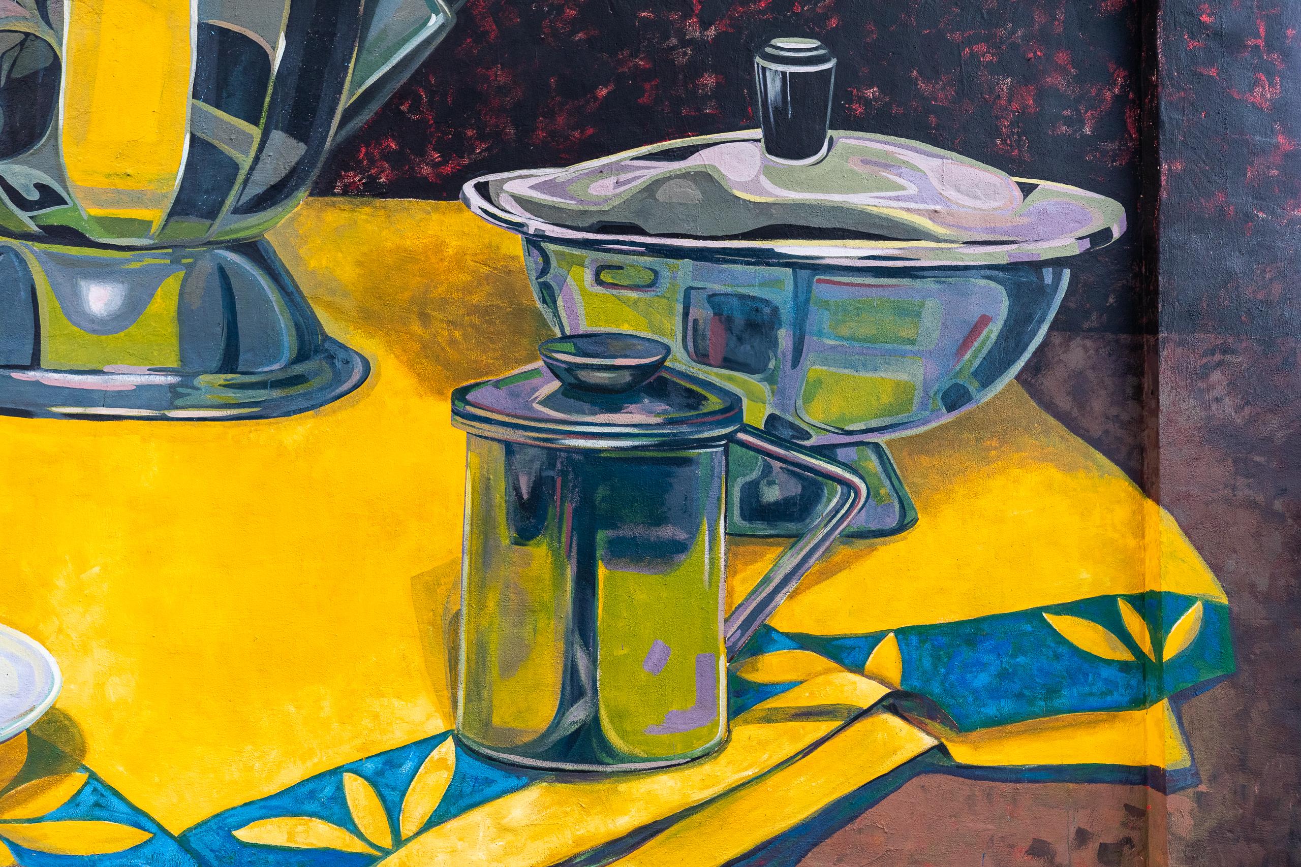В основе композиции лежат реальные предметы быта, которые художница перенесла в живописный эскиз, а затем на поверхность технической подстанции: мы видим хромированный чайник, расписную банку, нарезанный лимон и прочие предметы для чаепития.