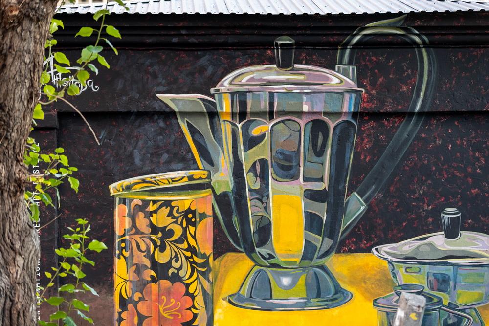 В Екатеринбурге начинающая уличная художница Юлия Антонова украсила стену здания технической подстанции ярким классическим натюрмортом. «Чайник и лимон» появились на Заводской, 32 к 1. Это первый натюрморт в истории фестиваля «Стенограффия».