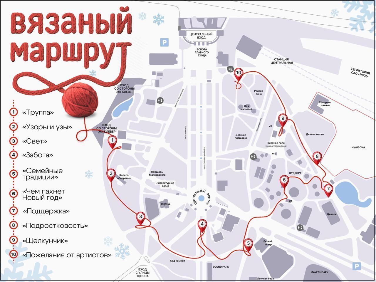 В парке Маяковского появился «Вязаный» интерактивный маршрут (0+) для прогулок. На нем расположены десять арт-объектов, которые создали мамы артистов-подростков, занятых в премьере балета «Щелкунчик» (6+). Среди них: «Подростковость», «Чем пахнет Новый год», «Свет».