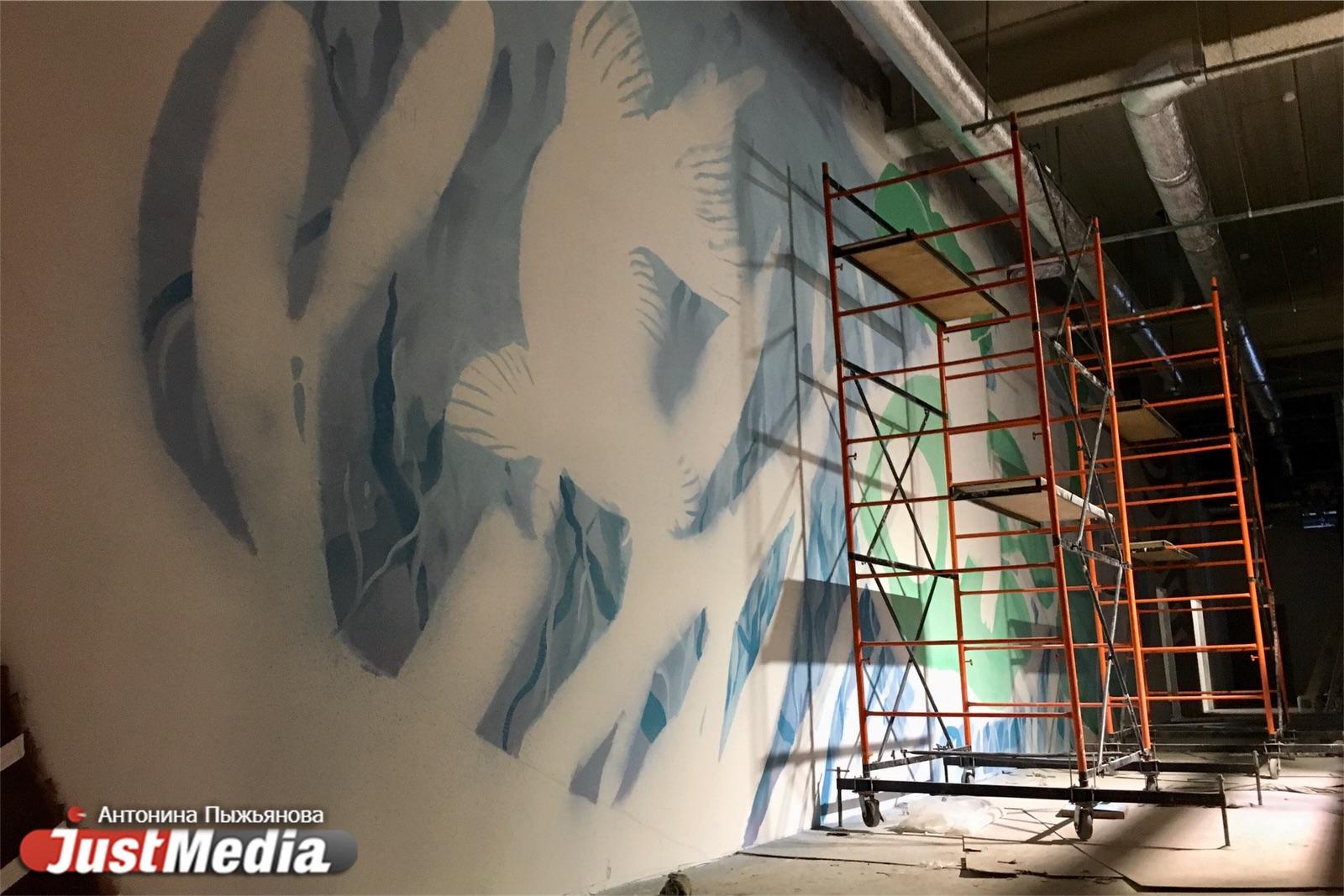 В Екатеринбурге на третьем этаже «Гринвича» продолжается подготовка к открытию первого в городе фурмаркета. К созданию дизайна присоединились местные уличные художники - Александр Конышев (357 Ural), Егор Горе и Рома Инк. Всего они распишут 4 большие стены.