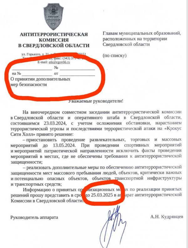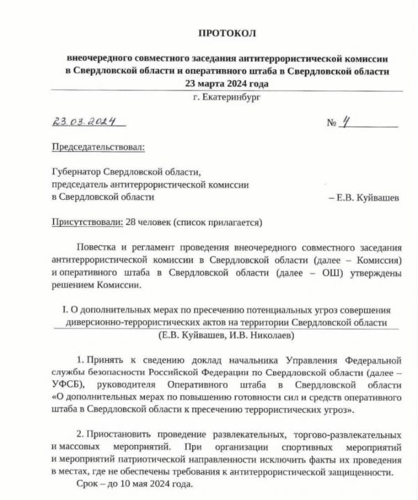 В свою очередь, в сеть утекли документы за подписью министра общественной безопасности региона Александр Кудрявцева, якобы разосланные по итогам заседания комиссии муниципалитетам. В них указывалась дата – 13 мая 2024 года. При этом шапка документа не была заполнена, из чего ряд СМИ сделали вывод, что это фейк. В понедельник утром в сети появился новый документ, уже с заполненной шапкой и новым сроком – до 10 мая. При этом ограничение не коснулись спортивных и патриотических мероприятий.
