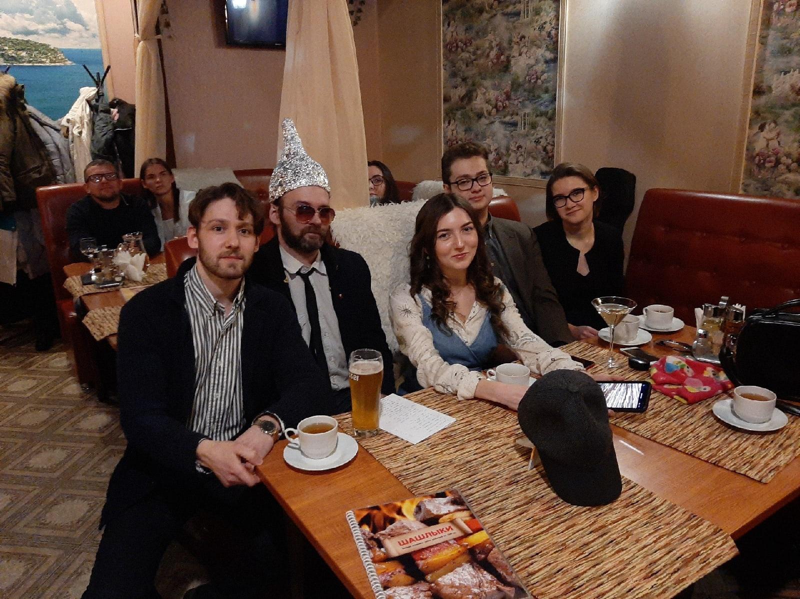 Мероприятие проходит в закрытом формате в маленьком неприметном кафе в центре Екатеринбурга. Внутри аляповатые интерьеры из 90-х, огромный дискошар и картонная фигура Алёшеньки в человеческий рост. Если не присматриваться, то можно подумать, что попал на провинциальный корпоратив.