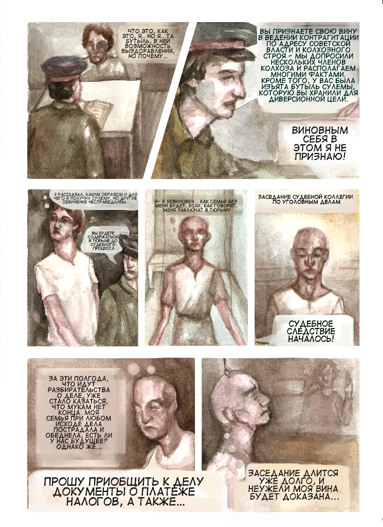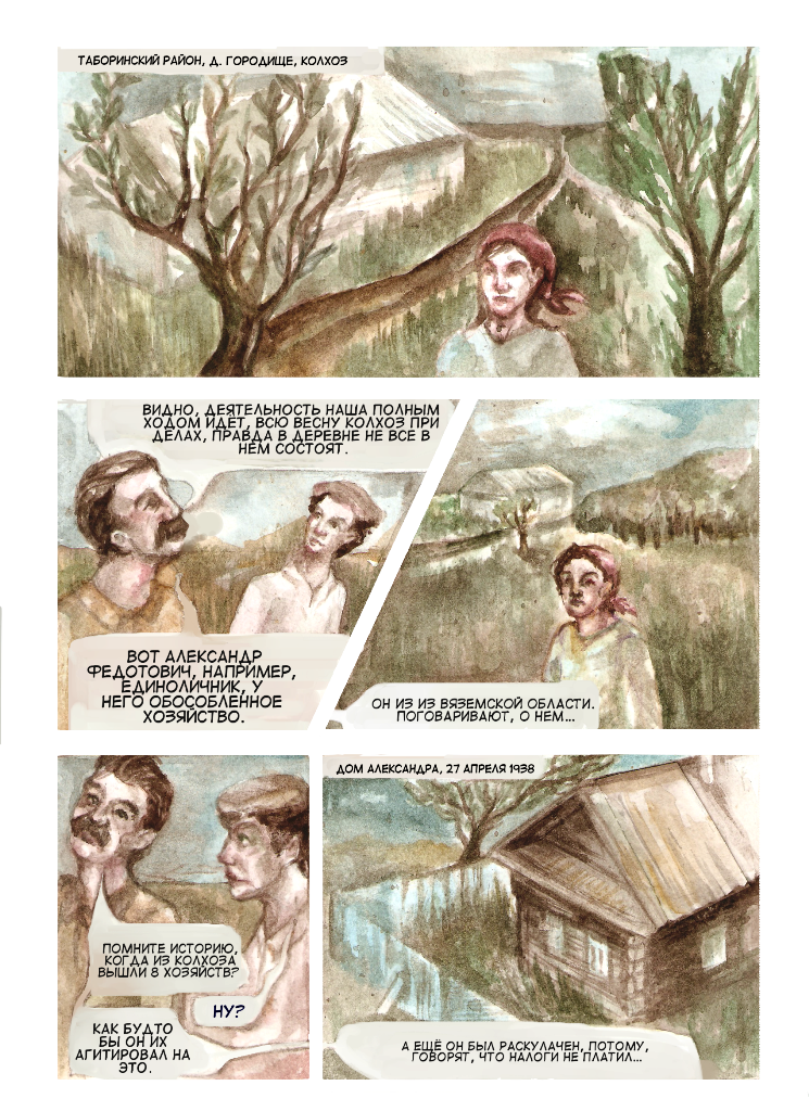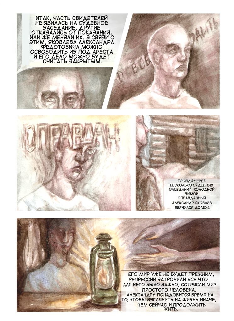 Второй комикс, нарисованный Сашей Шиловой, рассказывает о деле хлебороба и бывшего кулака Александра Яковлева. Крестьянин из деревни Городище был арестован после проведения обыска 28 апреля 1938 года, во время которого были обнаружены «аппарат самогона, аппарат для самогоноварения и одна бутылка раствора сулемы». Яковлева обвинили по статьям 58-9 и 58-10 УК РСФСР – «диверсия» и «антисоветская агитация и пропаганда». Позже мужчина был оправдан.