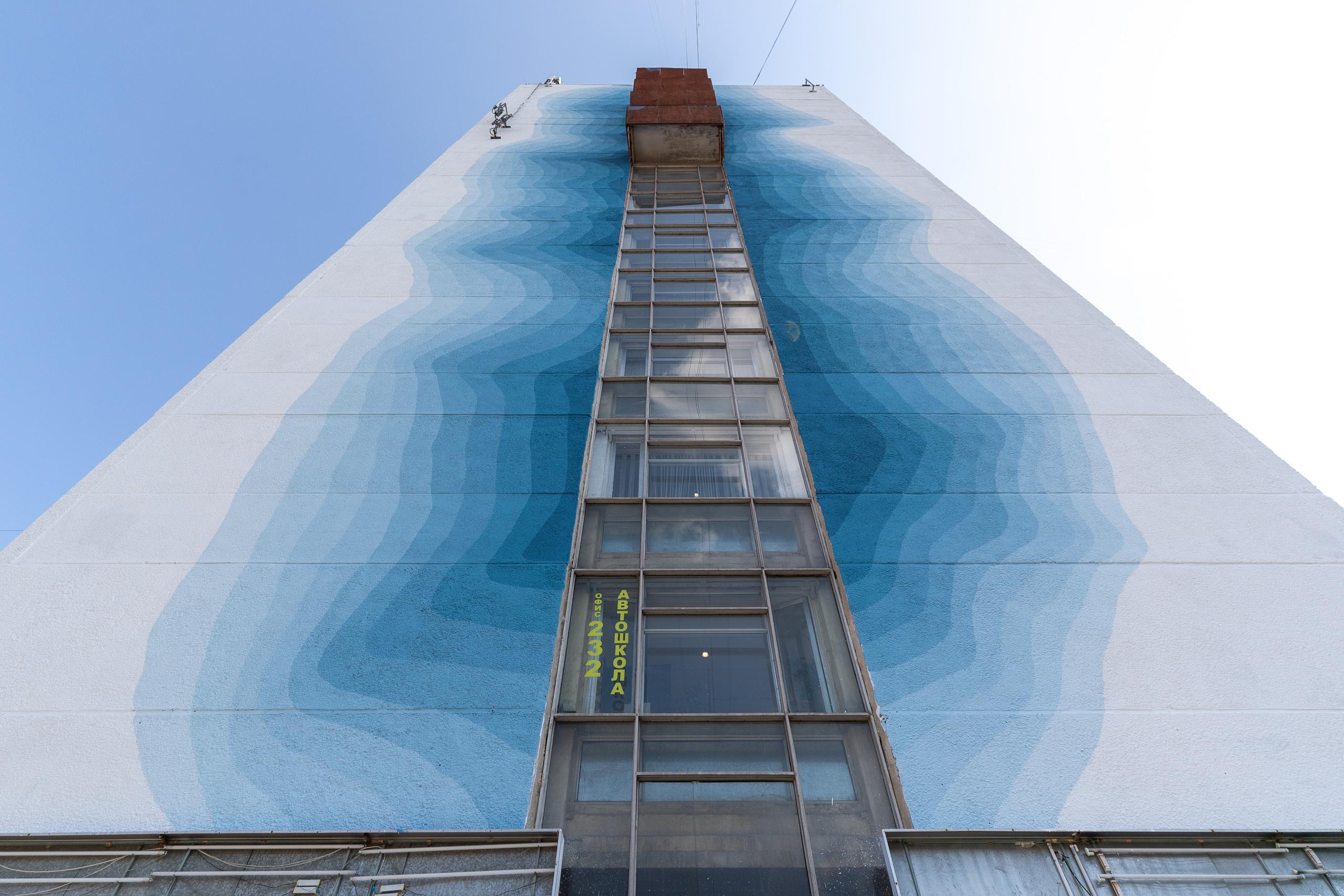 Новый масштабный арт-объект появился в Екатеринбурге на стене общежития Уральского института управления по адресу 8 Марта, 70. В рамках международного проекта STENOGRAFFIA итальянский автор Roberto Ciredz создал произведение на стене и задействовал около 500 квадратных метров. Художник сочетал в работе геометрию и пейзаж. У него получился гигантский голубой тающий ледник.