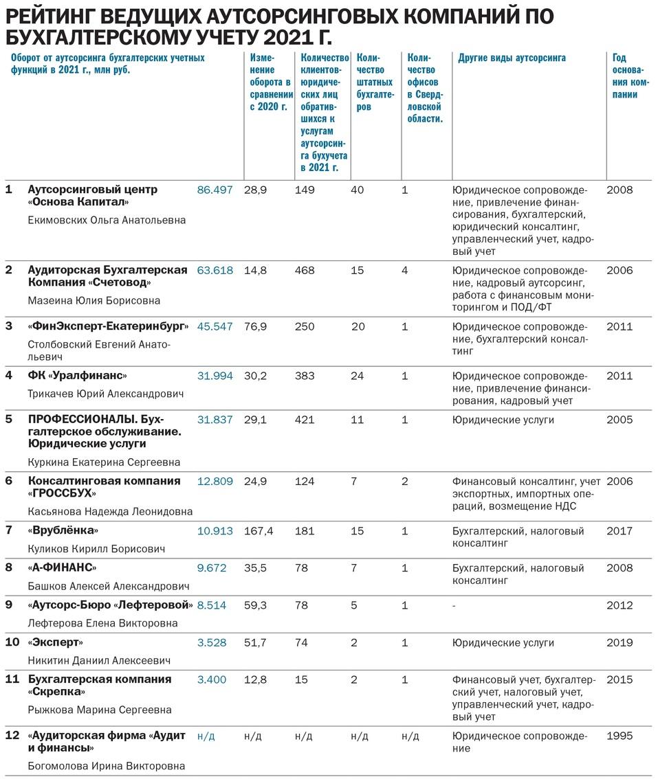 «Деловой Квартал» составил рейтинг ведущих аутсорсинговых бухгалтерских компаний Екатеринбурга. В него вошли региональные классические компании, специализирующиеся на услугах налогового и бухгалтерского учета.
