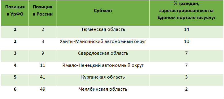Экспертная группа URFOTech, основываясь на данных Минкомсвязи России (январь 2014 года), составила рейтинг регионов Уральского федерального округа по доле граждан, зарегистрированных на Едином портале государственных услуг (ЕПГУ, gosuslugi.ru).