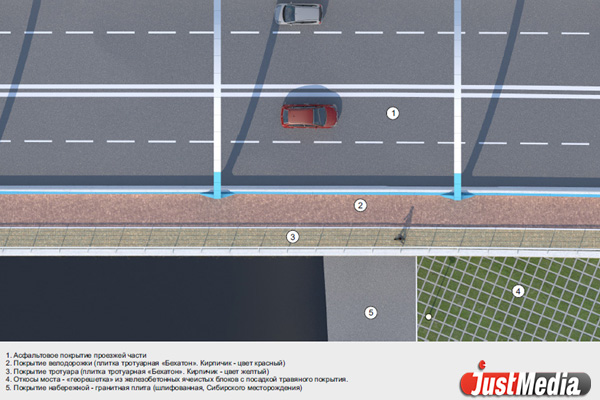 Протяженность моста через реку Исеть составляет 100 метров, с учетом протяженности дорожного полотка — 600 метров. Мост будет иметь по две полосы в каждом направлении, двухметровые велодорожки и тротуар по бокам. Велодорожки и пешеходные дорожки выложат бехатоновыми плитками. Набережную покроют гранитной плитой.