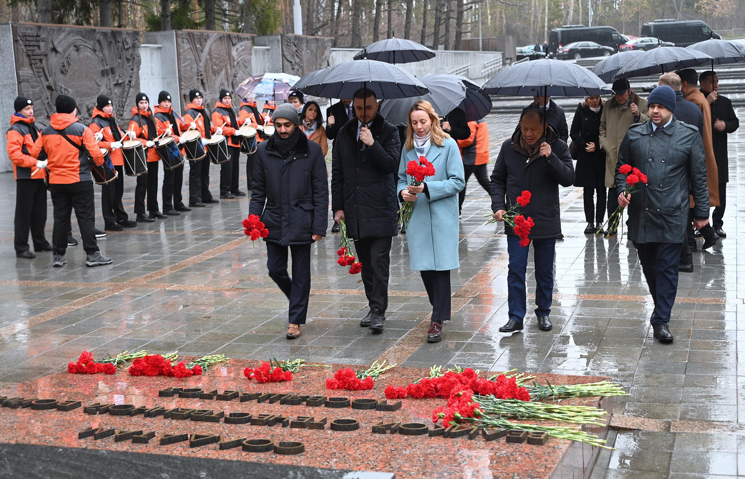 На Широкой речке дипломаты почтили память воинов Великой Отечественной войны минутой молчания и возложили цветы к Вечному огню.