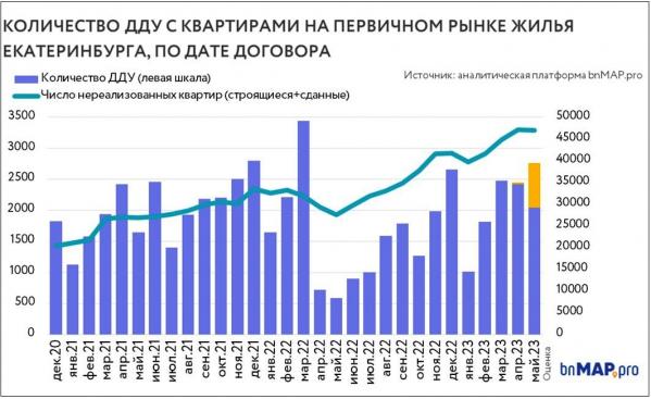 В Екатеринбурге на фоне рекордного объема предложения на рынке новостроек сохраняется высокий рост продаж. По словам руководителя аналитического отдела Уральской палаты недвижимости Михаила Хорькова, число нереализованных новостроек остается на отметке 47 тысяч квартир (Еще в середине мая этот показатель был на уровне 45 тысяч квартир). Из них только 2,9 тысяч сданы в эксплуатацию, остальные находятся на стадии строительства. Роста числа сданных в эксплуатацию, но непроданных квартир не происходит. Исторический рекорд по объему предложения пока не пугает застройщиков, которые продолжают готовить к выводу на рынок новые проекты.