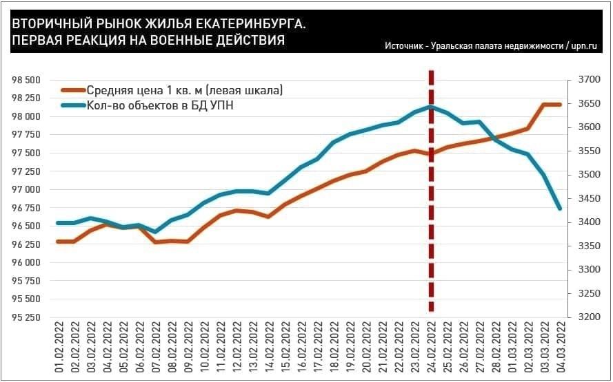 «Вторичный рынок жилья Екатеринбурга отреагировал на текущую ситуацию вполне прогнозируемо. Покупатели торопятся закрыть подготовленные сделки, растерянные продавцы снимают квартиры с продажи. При этом новые продавцы на рынок не спешат. С 25 февраля объем предложения после непродолжительного периода роста, начал быстро снижаться. Все это происходит на фоне панических настроений, поэтому движение рынка в ближайший месяц может быть непоследовательным. Необходимо с осторожностью воспринимать текущую эмоциональную реакцию, как продавцов, так и покупателей», — говорит руководитель аналитического отдела Уральской палаты недвижимости Михаил Хорьков.