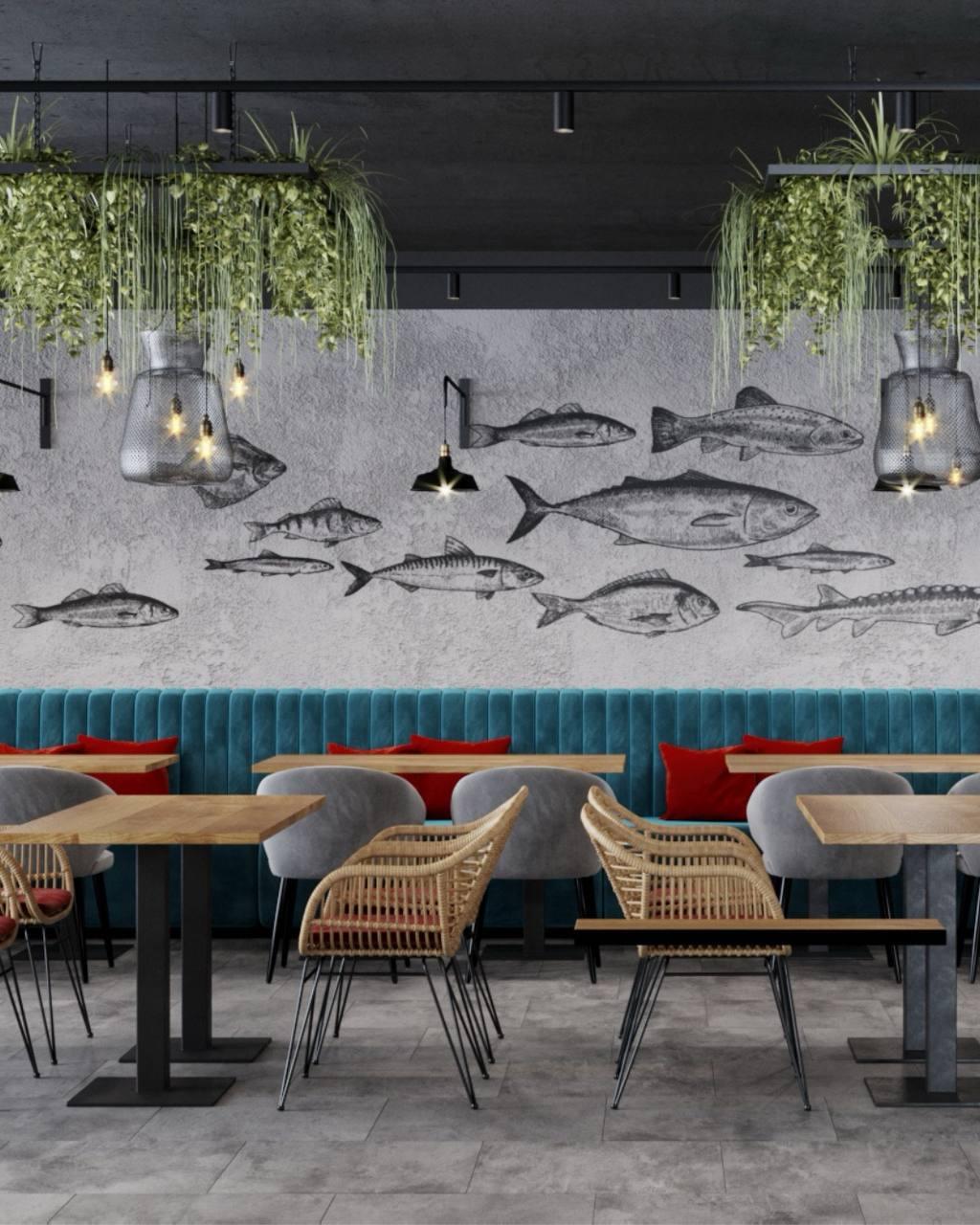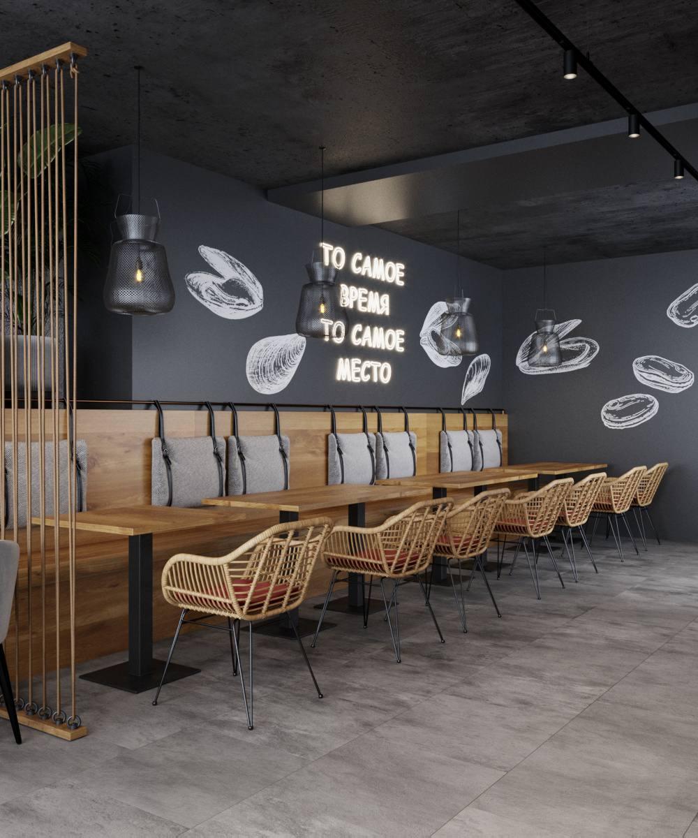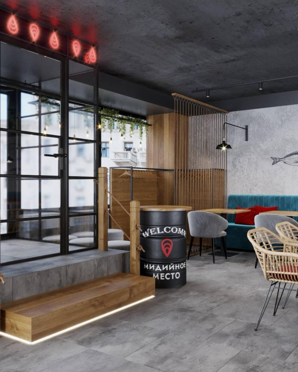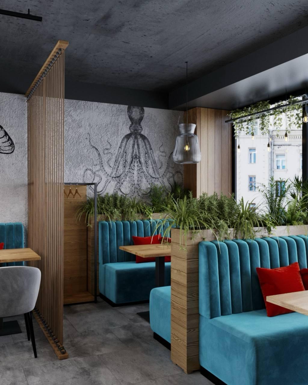 В отделке заведения использовано дерево и металл. Основные цвета: серый различных оттенков и светло-коричневый. Яркими акцентами стали темно-бюрюзовые мягкие диваны и алые подушки на них. Стены объекта украшают рисунки морских обитателей. Также, судя по рендерам, в заведении много зелени.