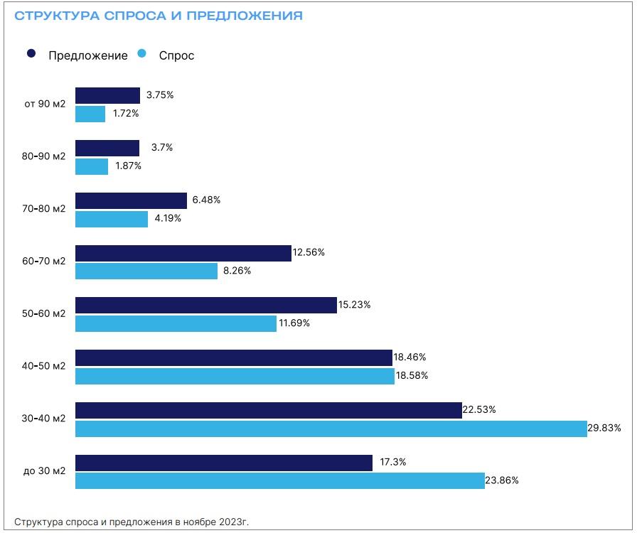 Так, по данным аналитического сервиса «Объектив.РФ», сегодня рынке новостроек сегмент квартир площадью 30-40 «квадратов» занимает 22,53%, объектов площадью до 30 «квадратов» — 17,3%. Лишь в сегменте квартир площадью 40-50 кв. метров объем спроса и предложения почти одинаковый.