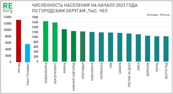 Так, в столице России проживает примерно 13 млн человек, в северной столице нашей страны — около 6 млн человек, в Новосибирске — более 1,6 млн человек, в Екатеринбурге — около 1,6 млн человек, в Казани — 1,3 млн человек.