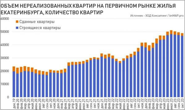 «Число нереализованных квартир снизилось с 51 тысячи в июле до 49 тысячи в октябре 2023. Из них лишь около 2 тысяч квартир сданы в эксплуатацию, остальные находятся на стадии строительства. В последние месяцы девелоперы продолжали выводить на рынок новые квартиры, но быстрый рост ассортимента был остановлен повышенным спросом со стороны покупателей. В последние месяцы объем продаж был выше темпов пополнения рынка», — отмечает руководитель аналитического отдела УПН Михаил Хорьков в Телеграм-канале Reburg Ekb.