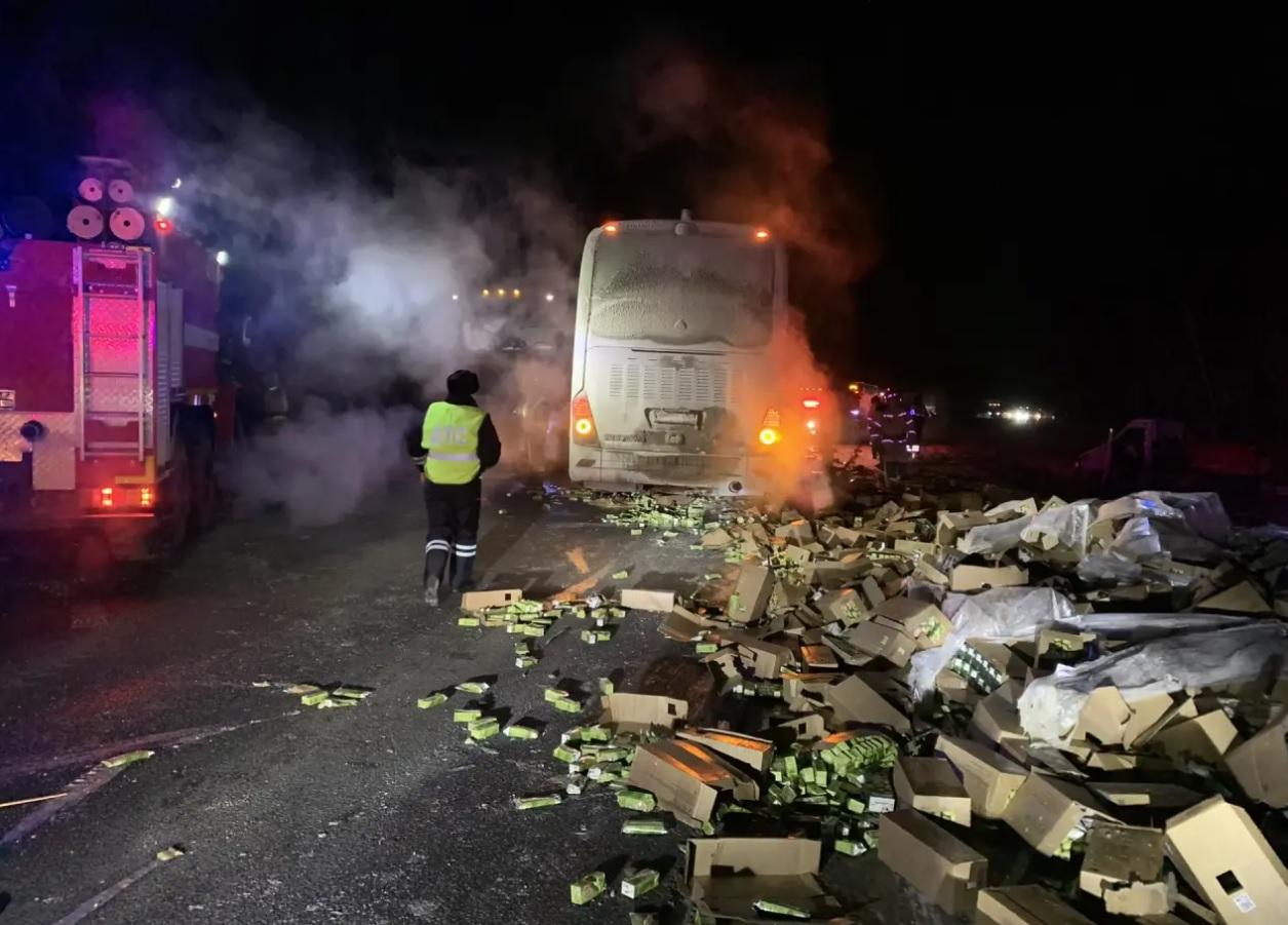 По данным ГАИ региона, водитель «КАМАЗа», перевозившего партию сока, врезался в стоящий впереди тягач «Mercedes-Benz Actros». От удара «КАМАЗ» отбросило на встречную, где он столкнулся с «Sollers Atlant». Последний съехал в кювет. А из кузова «КАМАЗа» высыпалась часть часть перевозимой партии.