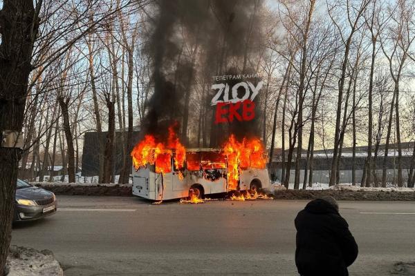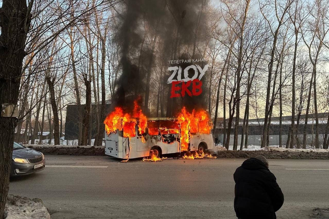 В Екатеринбурге на улице Новинская, 2, пассажирский автобус внезапно загорелся по неизвестной причине.