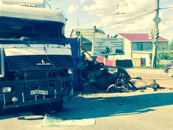 От удара прицеп грузовика перевернулся и его содержимое вывалилось на проезжую часть.