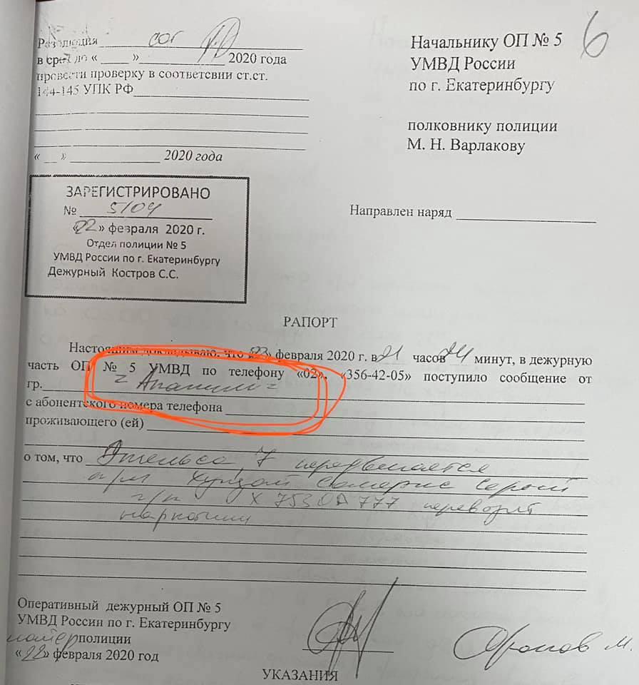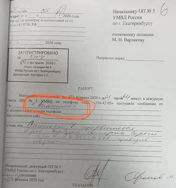 Для подтверждения адвокат приложил к посту снимок рапорта, в котором написано, что в дежурную часть ОП № 5 за час до задержания Литреева позвонил неизвестный и сообщил о готовящемся преступлении.