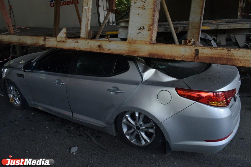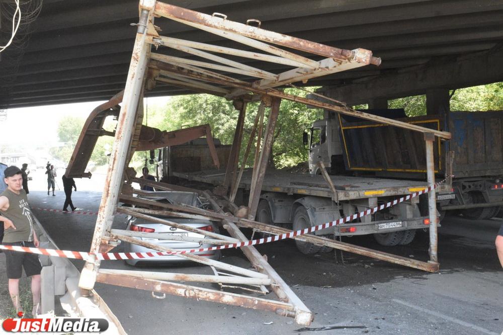 «Водитель, управляя грузовым транспортным средством КамАЗ, перевозил негабаритный груз, в ходе движения совершил наезд на сооружение с последующим опрокидыванием металлической конструкции, в результате чего металлическая конструкция упала на транспортное средство KIA Optima, движущееся в попутном направлении. В результате дорожно-транспортного происшествия пострадало четыре человека, в том числе двое детей 14 и 8 лет. Участники ДТП доставлены в лечебные учреждения», - рассказал врио начальника УГИБДД Екатеринбурга Павел Крылов.
