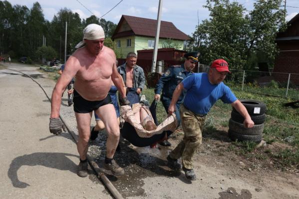 Огнеборцам помогают местные жители: кто-то окапывает железнодорожный проезд, а автомобилисты передают друг другу предупреждения об объезде улицы, чтобы не мешать пожарным. Предприятие «Технониколь» привезло куб воды на пожар.