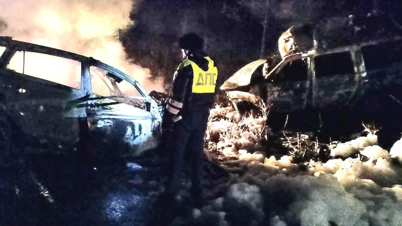 На месте ДТП работают сотрудники полиции и МЧС, проводятся работы по ликвидации последствий аварии. Возгорание транспортных средств ликвидировано.