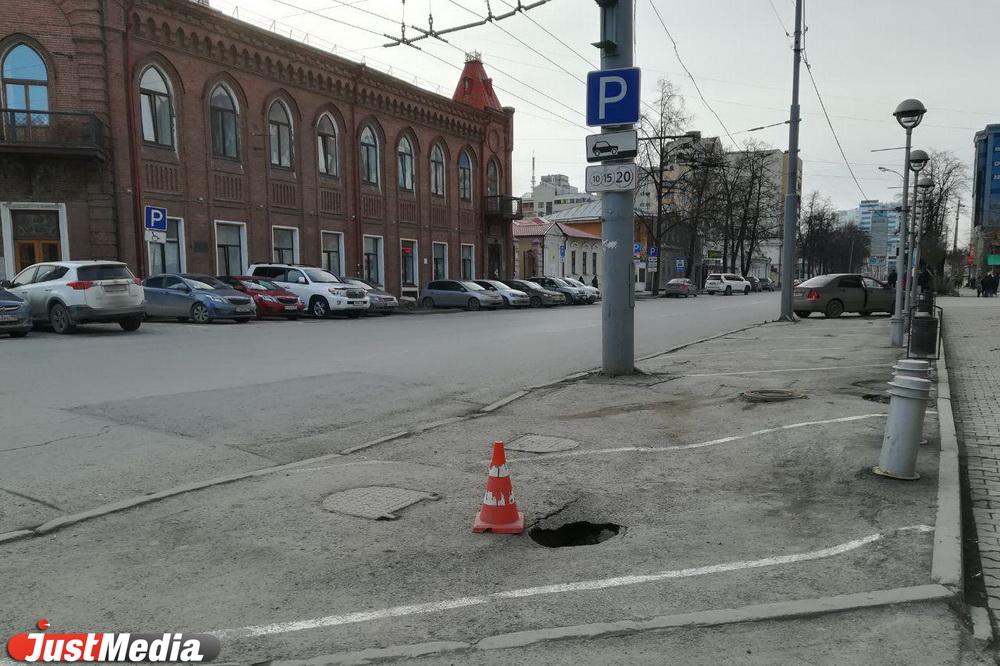 Сегодня парковочное место отгорожено конусом. Дыра образовалась в районе канализационного колодца.