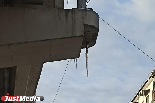 Жители Екатеринбурга пожаловались на огромные сосульки, повисшие над проезжей частью и пешеходами на перекрестке Московская – Большакова. Опасные ледяные глыбы повисли под автомобильным мостом, угрожая автомобилям и людям.